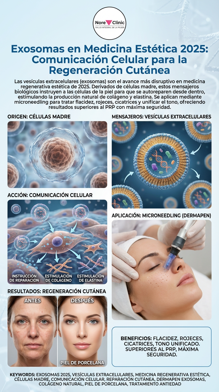 ¿Has sentido alguna vez que tu piel ha perdido su capacidad de recuperación? Que las noches sin dormir, el estrés o el paso del tiempo dejan una huella más profunda y duradera de lo que solían hacerlo. Muchos tratamientos prometen resultados, pero pocos trabajan con la inteligencia natural de tu propia piel. En Nore Clinic, comprendemos esta frustración. Buscamos constantemente los avances más innovadores que no solo disfracen los signos del envejecimiento, sino que activen los mecanismos intrínsecos de reparación del organismo. Hoy, te presentamos una revolución: los exosomas, el corazón de la medicina regenerativa estética más avanzada.