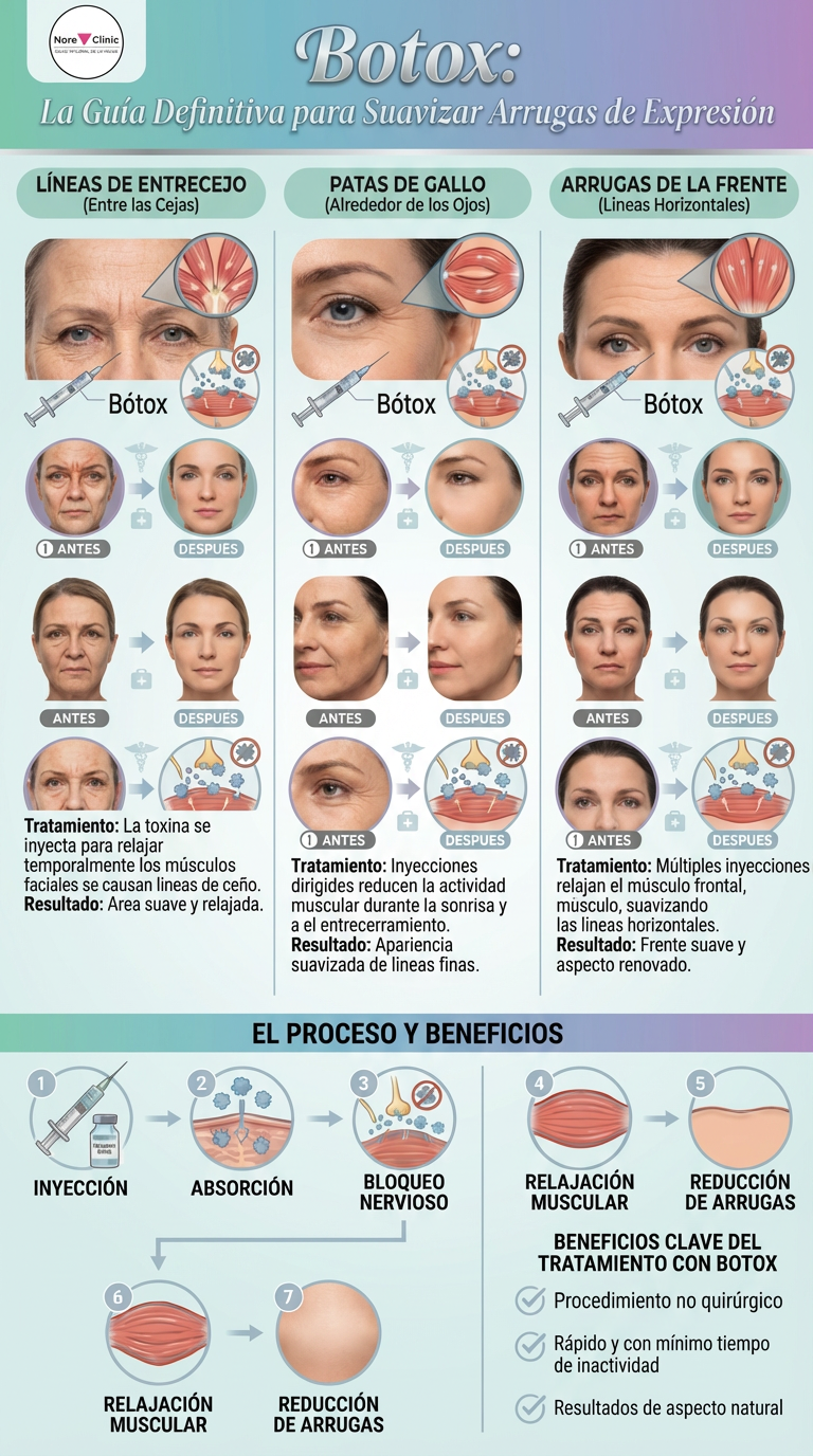 En Nore Clinic, entendemos que las primeras arrugas que aparecen en nuestro rostro suelen ser aquellas marcadas por la expresión: el ceño fruncido al concentrarnos, la sonrisa amplia que dibuja líneas en el contorno de los ojos o la sorpresa que pliega nuestra frente. Son las llamadas arrugas dinámicas, y aunque son testigo de una vida llena de emociones, a veces nos gustaría suavizarlas para recuperar una mirada más fresca y descansada, sin por ello renunciar a nuestra capacidad de expresión. Es aquí donde la toxina botulínica, comúnmente conocida como Botox, se convierte en una de las herramientas más precisas y efectivas de la medicina estética moderna.